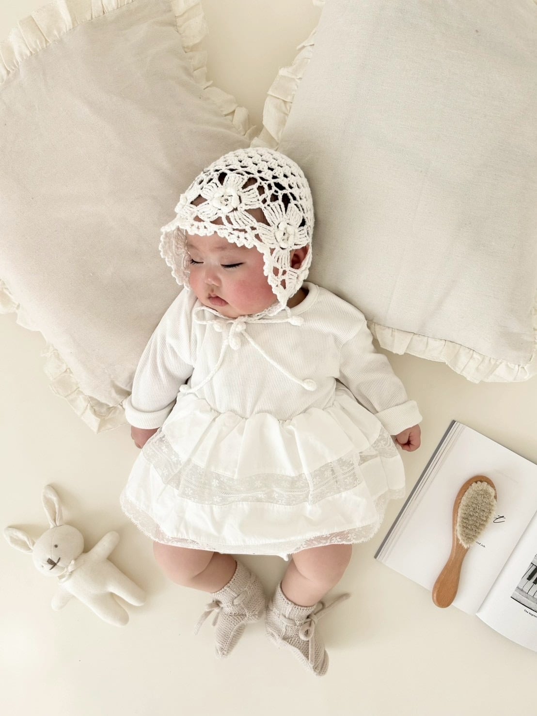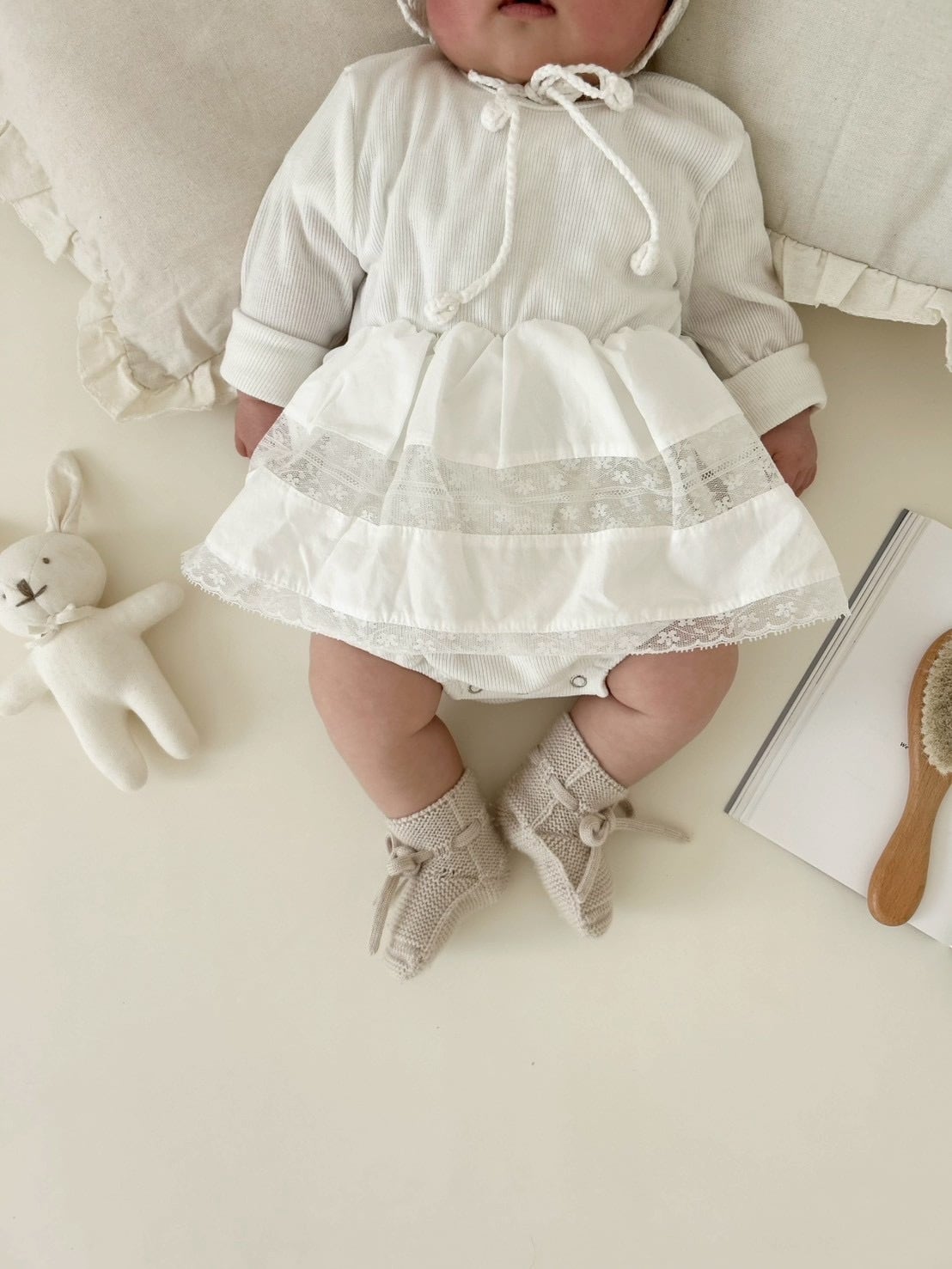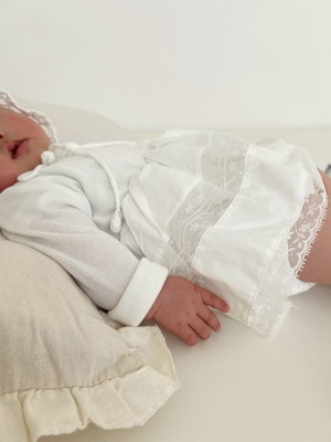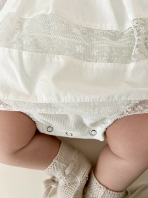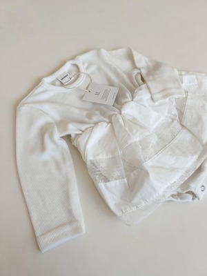 *即納完売後はお取り寄せ枠のご購入をおすすめいたします。 再販ご希望の方は、再販通知が届くようお気に入り登録をお願い致します。 カラー:アイボリー 平置きサイズ(㎝) サイズ/着丈/身幅/袖丈 1号(0‐6m相当) /33.5/20.5/22 2号(6ー12m相当) /38.5/22.5/24 3号(12‐18m相当) /41.5/23.5/26.5 model 0y4m / 54cm / 2号size着用