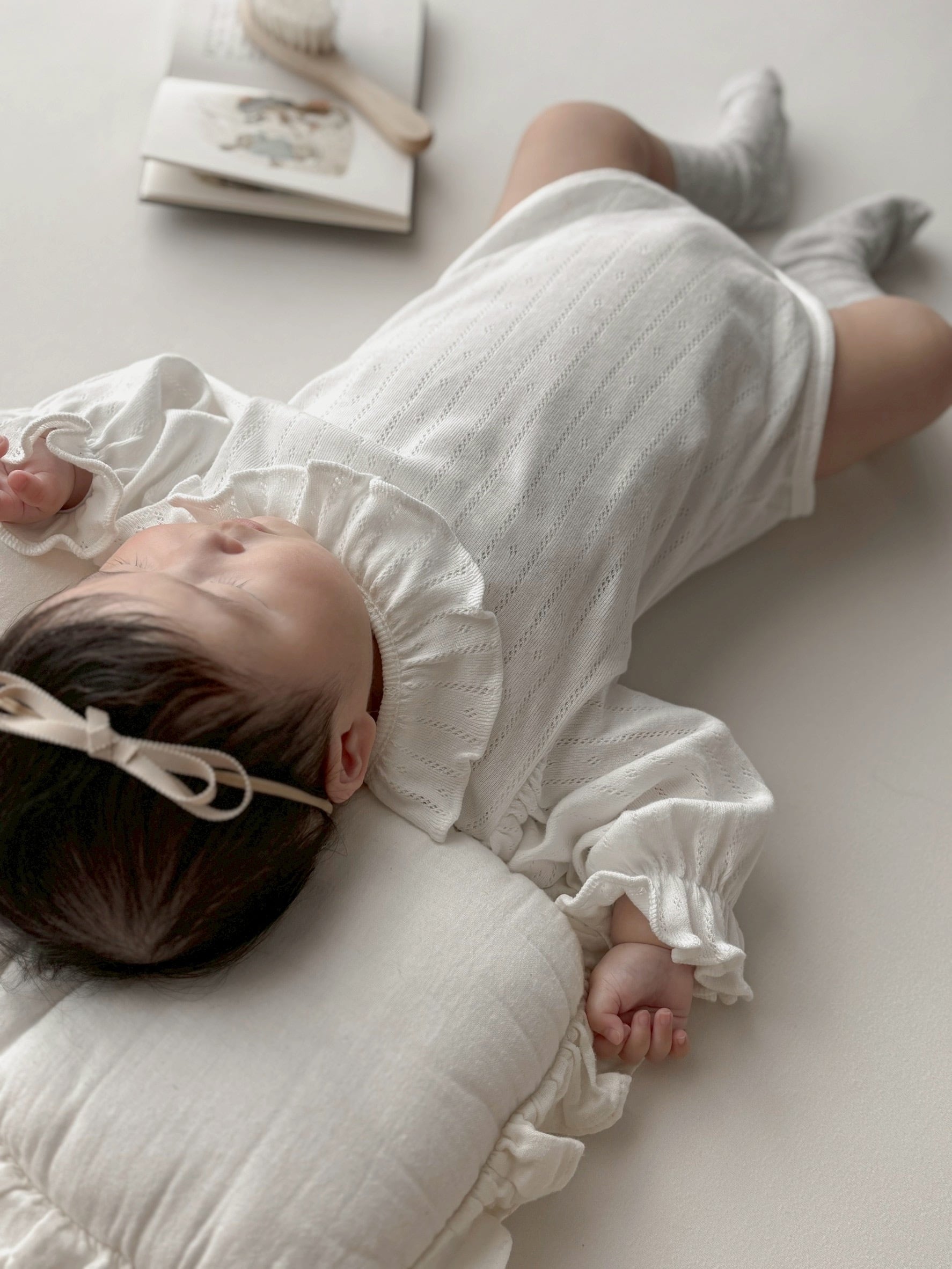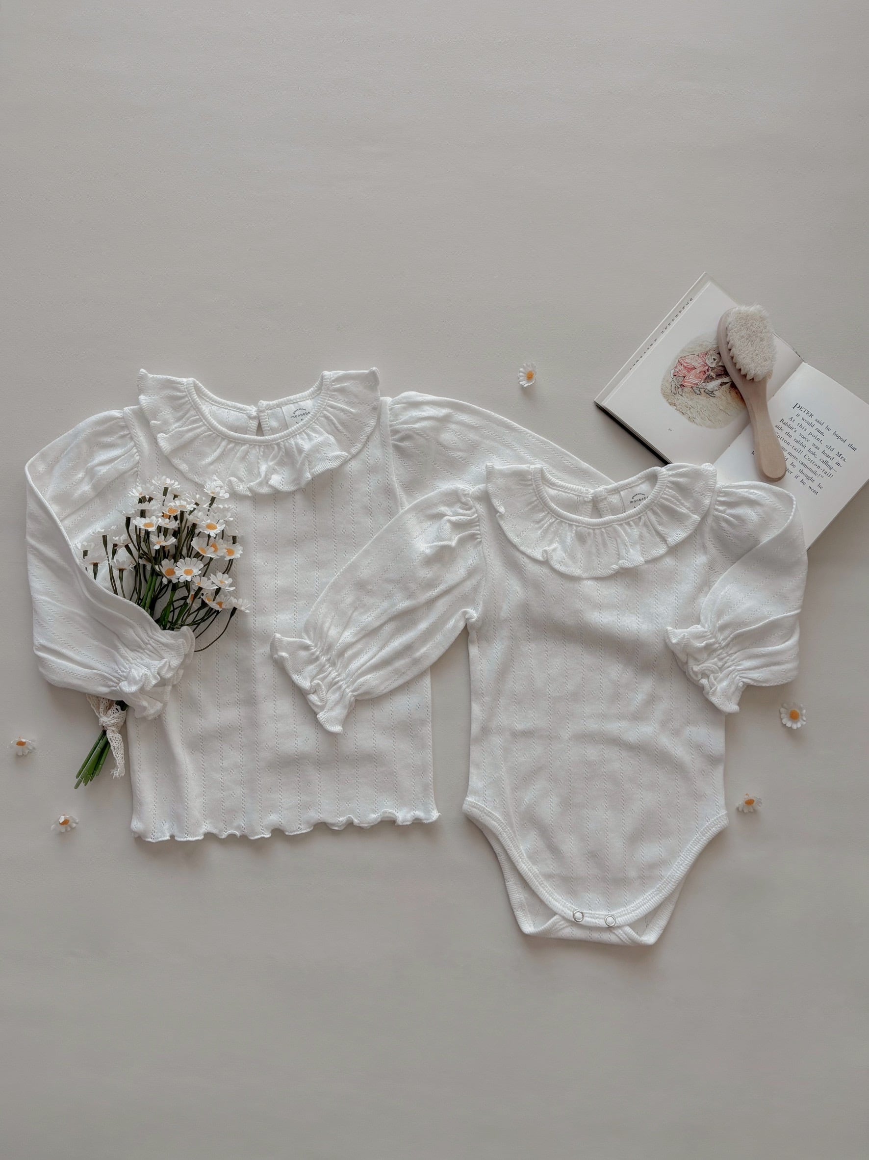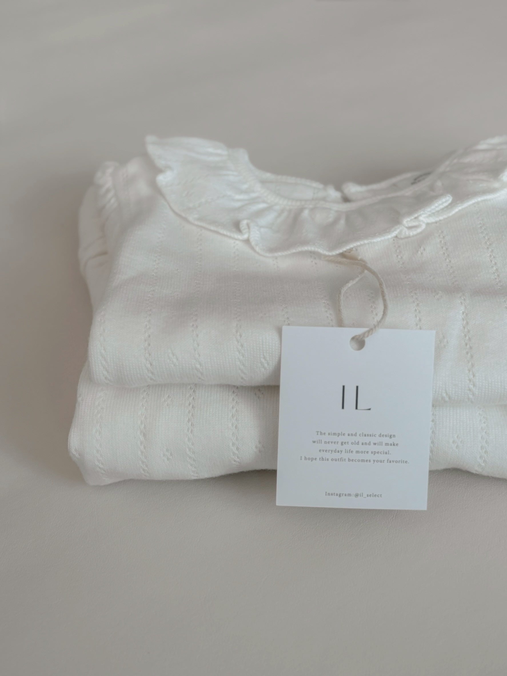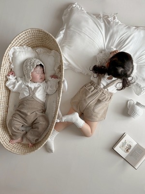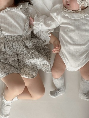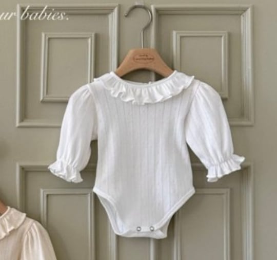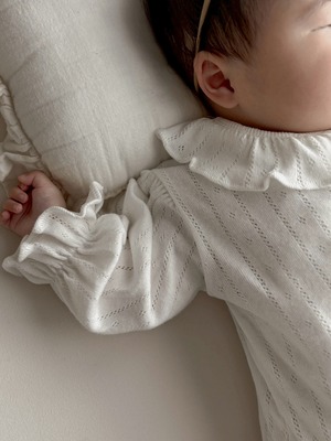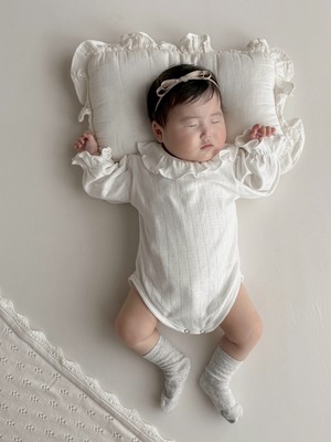 *即納完売後はお取り寄せ枠のご購入をおすすめいたします。 再販ご希望の方は、再販通知が届くようお気に入り登録をお願い致します。 カラー:アイボリー 素材:コットン100% 平置きサイズ(㎝) サイズ/着丈/身幅/袖丈 M(6ー12M) /38/23/22.5 L(12‐24M)/41/24/25 model 0y5m / 61cm / Msize